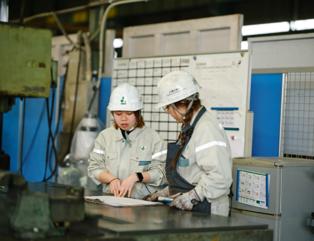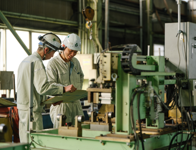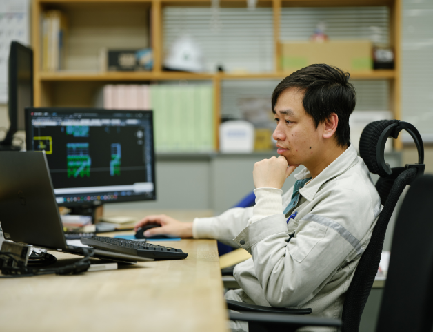製造部門は、設計した図面をもとに、機械製品の制作、組み立て、検査、納品後のメンテナンスに至るすべてのステップを、日本とベトナムの金属加工工場で協力し合いながら行います。徹底した品質管理と安全管理のもと、技術者はスキルを磨き続け、必要な資格取得も行っています。