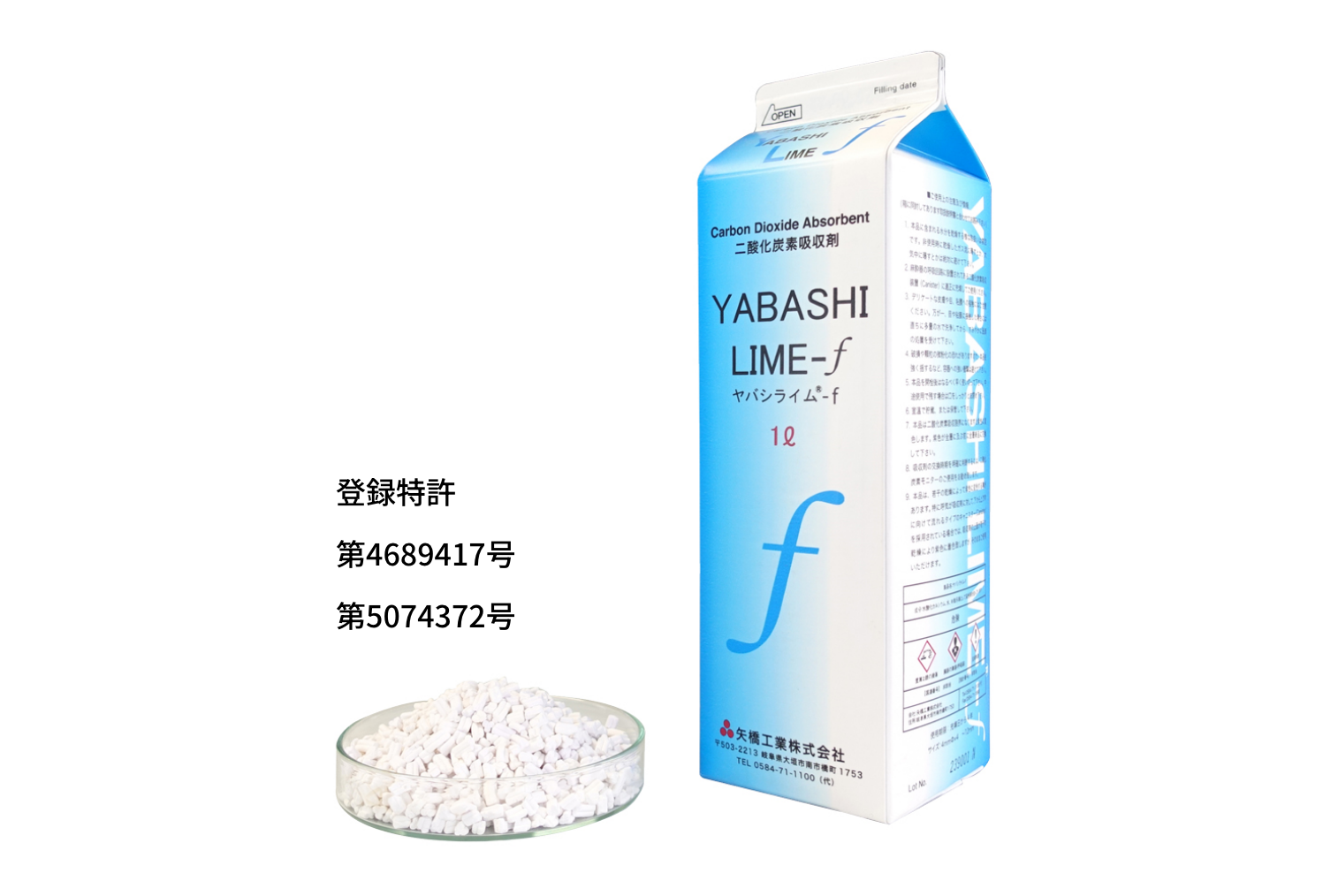 ヤバシライム®-f は、吸入麻酔薬の使用時に二酸化炭素を吸収することを目的とした製品であり、「NaOH」を用いない新しい二酸化炭素吸収剤です。 有害な麻酔薬分解物が発生しないため、安全に麻酔を行うことができます。また、パッケージに遮光性、密閉性、利便性に優れる「特殊加工の1L紙パック」を採用しました。使いきり包装で、廃棄物処理コストの削減にも貢献します。その他に、呼吸機能検査、分析機器においてCO2の除去目的としても利用できます。