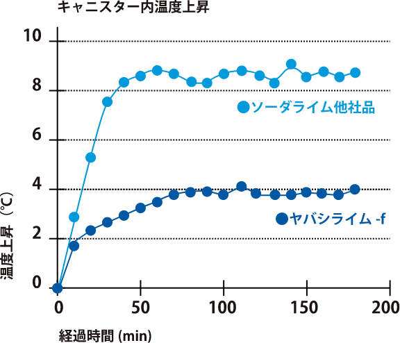 NaOHを含むソーダライムは二酸化炭素吸収時に大量の熱を発生させますが、ヤバシライム®-f はキャニスターの温度上昇が緩やかであり、熱がこもり易い低流量麻酔での安全性向上に適しています。