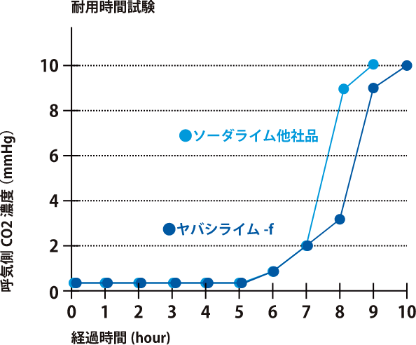 比表面積の高い特殊形状と特殊成分により高い吸収性能を実現しました。他のソーダライムと比較しても十分な吸収性能を有しています。
