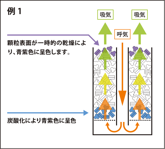 下図に記載されている様なキャニスター内で「呼気」が二酸化炭素吸収剤の層を「下」から「上」方向に向けて通過する構造の場合には、吸収剤の反応熱や換気 の影響で吸収剤顆粒の表面が一時的に乾燥する事により、吸収剤層の上面部分が青紫色に変色する事があり、吸収剤の消耗を示すものではありません。 この着色は水分の内部移動や再配分により解消されます。二酸化炭素ガスの吸収能力にはなんら問題はありませんので、そのまま続けてお使い下さい。 ※お願い (お使いの麻酔器キャニスターへの「呼気」流入方向や適正な充填量などに関してご不明の場合は、麻酔器の仕様書または麻酔器の製造元にて、ご確認される様お願いいたします)